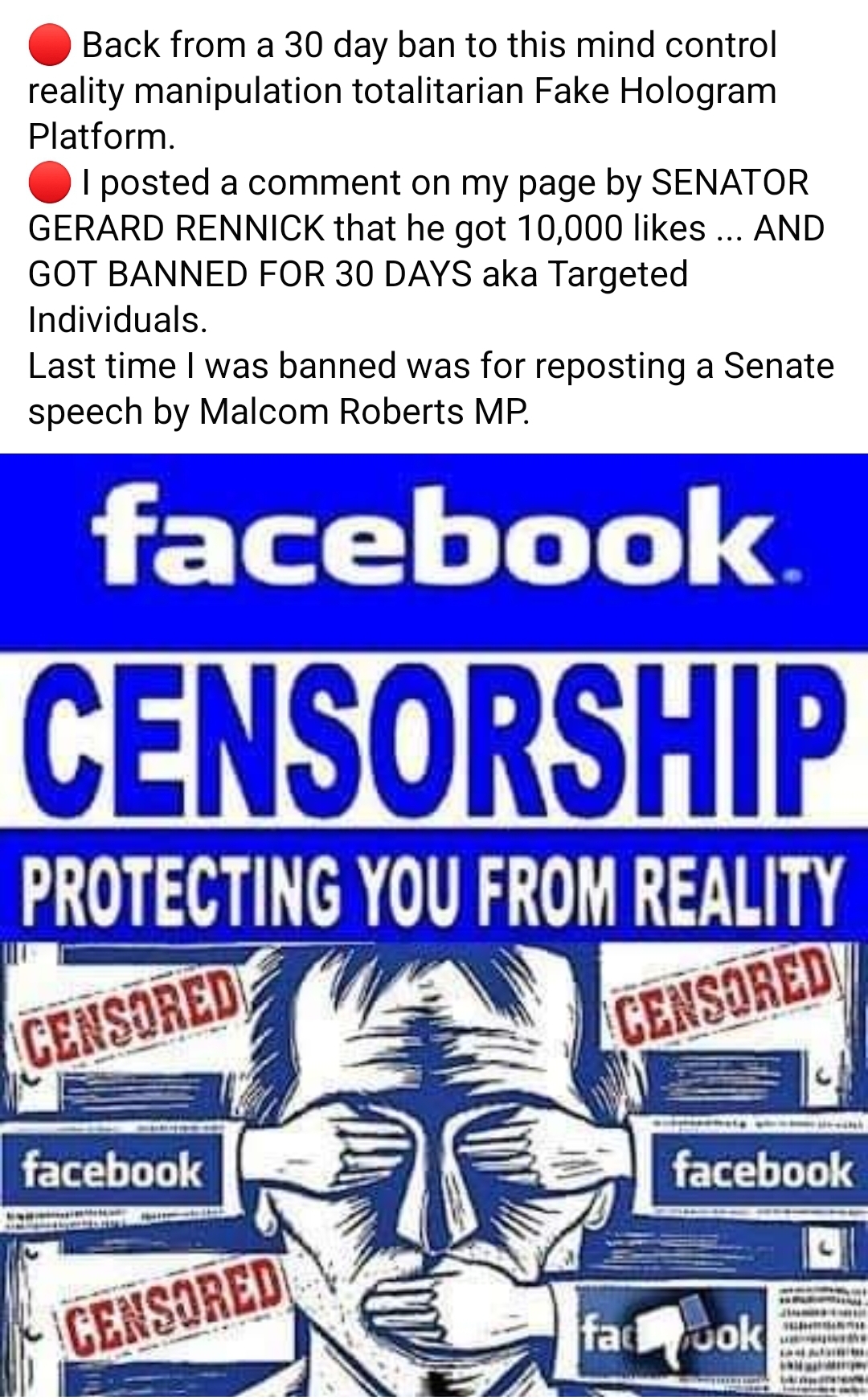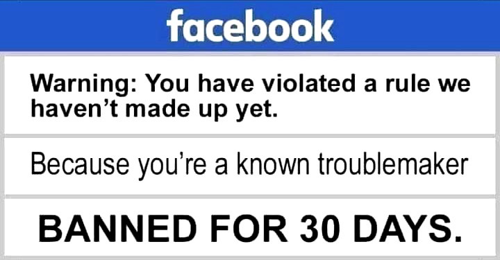• Government sponsored sinister people taking administration roles on local groups (that ban you even if your conduct is reasonable in presenting a differing view on something).